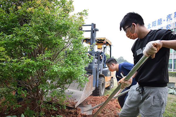 “樹坑要挖深一點,草屑要鋪均勻,袋裝的肥土均勻下在底部,填土時要把樹扶正,土一定要壓實……”在有經(jīng)驗的志愿者講解和指導下,平日里專注于產(chǎn)線的工人們,瞬間變成了一個個種樹能手。每個工序都一絲不茍,挖坑、施肥、填土、澆水,嚴謹?shù)轿弧km然揮汗如雨,但卻干勁十足。志愿者們這次栽種的是嘉寶果樹,由于樹苗較大較重,平時工作中的老伙計——叉車也出動了。幾個小時后,仕誠公司的草坪上,又翻出了許多新土,也增添了一排整齊翠綠的果樹。迎著春日的暖陽,志愿者們在新種的果樹前留下了美麗瞬間。